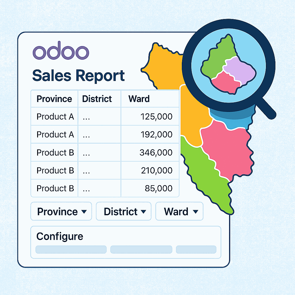 Để đáp ứng nhu cầu này, BizApps phát triển module mở rộng cho Báo cáo bán hàng Odoo, bổ sung bộ lọc địa lý chi tiết, giúp nhà quản lý dễ dàng phân tích và ra quyết định.