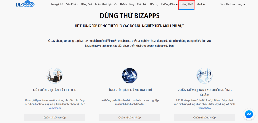 Bước 2: Sau khi đăng nhập bạn click vào “Dùng thử”, bạn hãy lựa chọn sản phẩm mà bạn muốn đăng ký dùng thử bản demo
