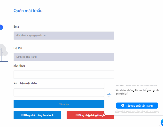 Bước 2: Nhập địa chỉ email đã dùng để đăng ký Bizapps và click Xác nhận