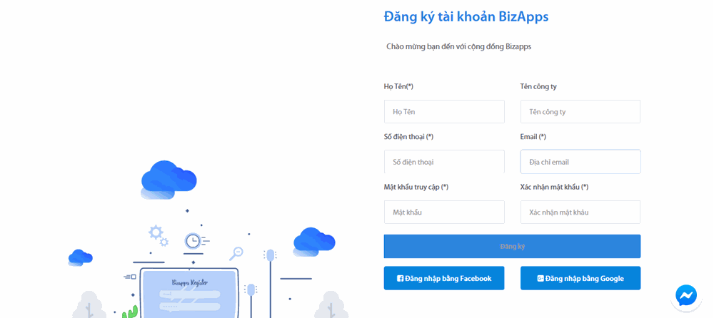 Bước 1: Tại trang chủ bizapps bạn chọn "Đăng ký" để vào biểu mẫu đăng ký.