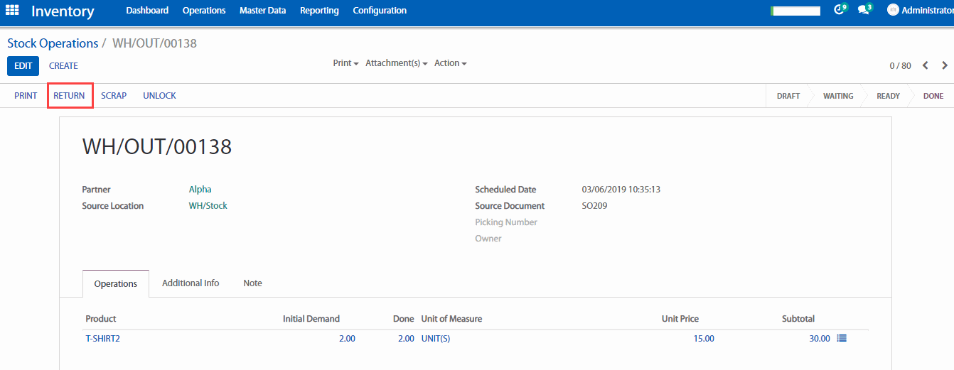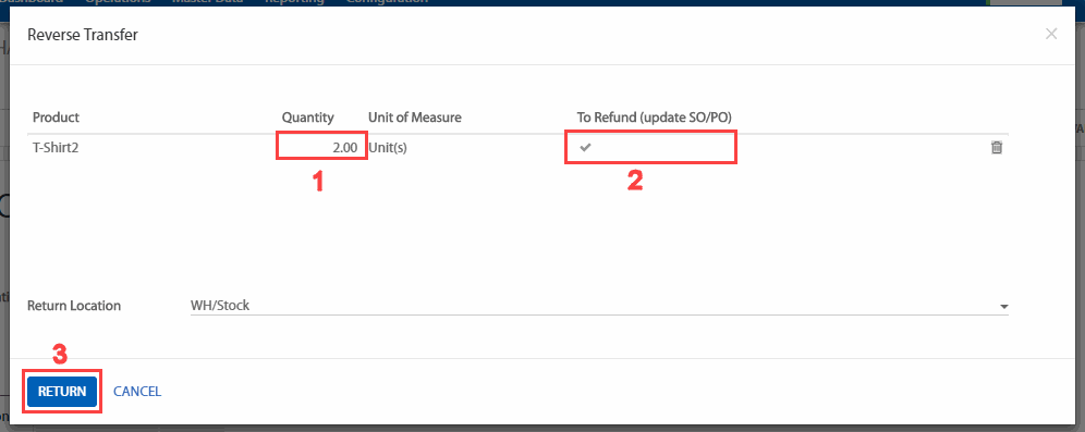 Bước 2: Tại form Reverse Transfer (trả lại hàng), bạn tiến hành nhập Quantity (Số lượng) khách hàng trả và check vào To refund (Hoàn trả) nếu cần hoàn tiền cho khách và chọn RETURN (Trả hàng) để hoàn tất việc trả hàng