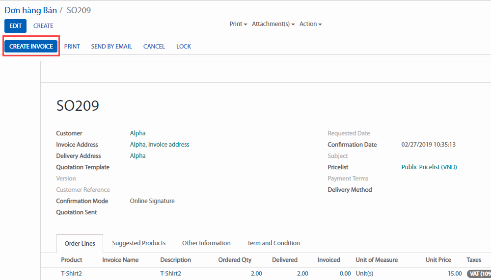 Bước 3: Tại đơn hàng bạn chọn CREATE INVOICE (TẠO HÓA ĐƠN) để tạo hóa đơn hoàn tiền cho khách. Lúc này, hệ thống đã cập nhật sẵn số lượng và số tiền phải trả trên hóa đơn cho bạn rồi.