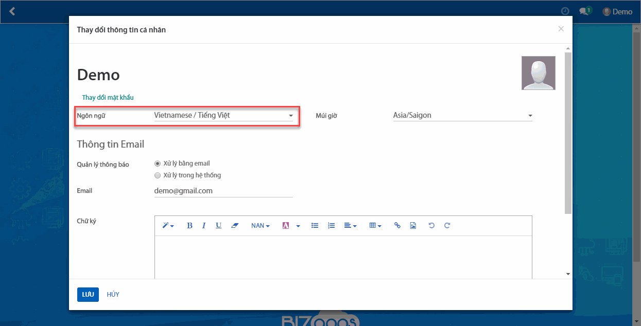 Bizapps cho phép mỗi một người dùng trong hệ thống có thể tự lựa chọn ngôn ngữ phù hợp nhất với bản thân
