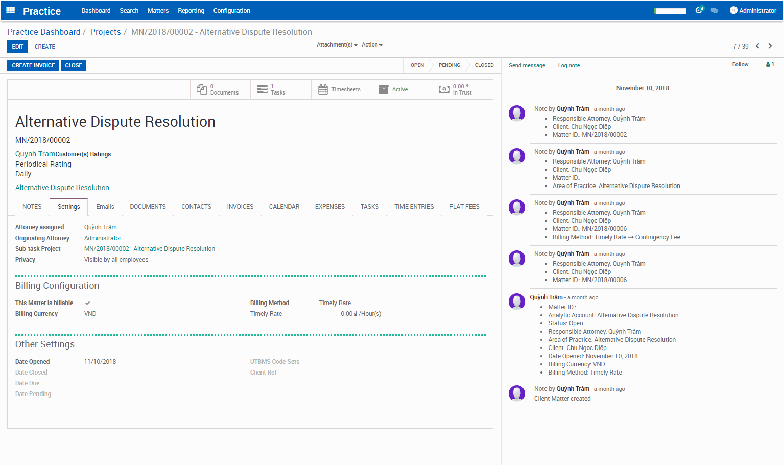 • Flat Fee: Thiết lập phí cố định cho vụ việc, khi tạo hóa đơn hệ thống sẽ tự động ghi nhận khoản phí này trên hóa đơn của khách hàng.