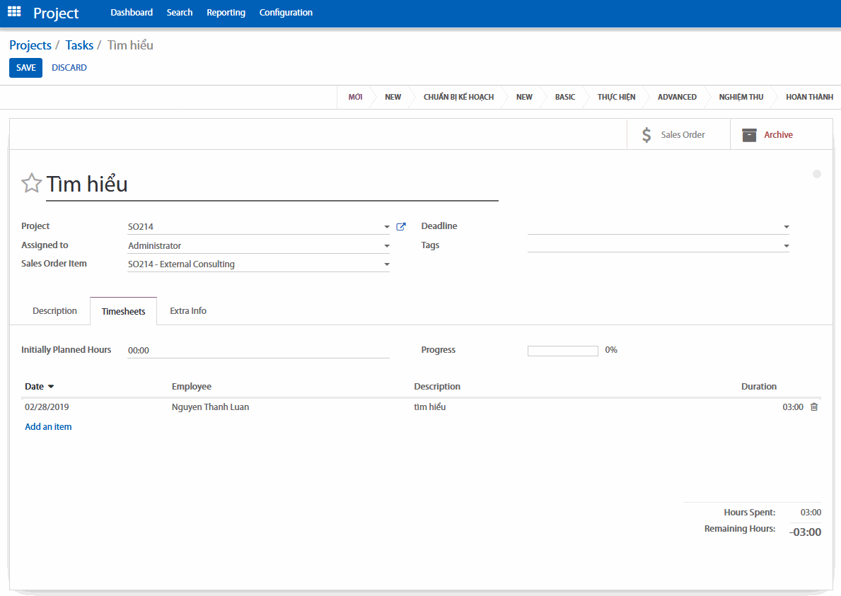 Khi đơn hàng đã được xác nhận sẽ tạo ra dự án tương ứng cho đơn hàng, vào tạo task nhập vào thời gian làm việc tương ứng