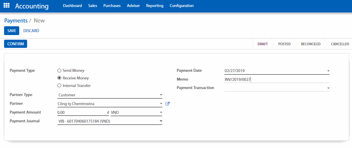 Khi đăng ký một khoản thanh toán mới, bạn phải chọn một khách hàng hay nhà cung cấp, phương thức thanh toán và số tiền thanh toán. Tiền tệ của giao dịch sẽ được phương thức thanh toán quy định. Nếu khoản thanh toán có liên quan đến một tài liệu (đơn đặt hàng bán, đơn mua hàng hoặc hóa đơn), hãy thêm mục tham khảo của tài liệu này vào ô ghi chú.