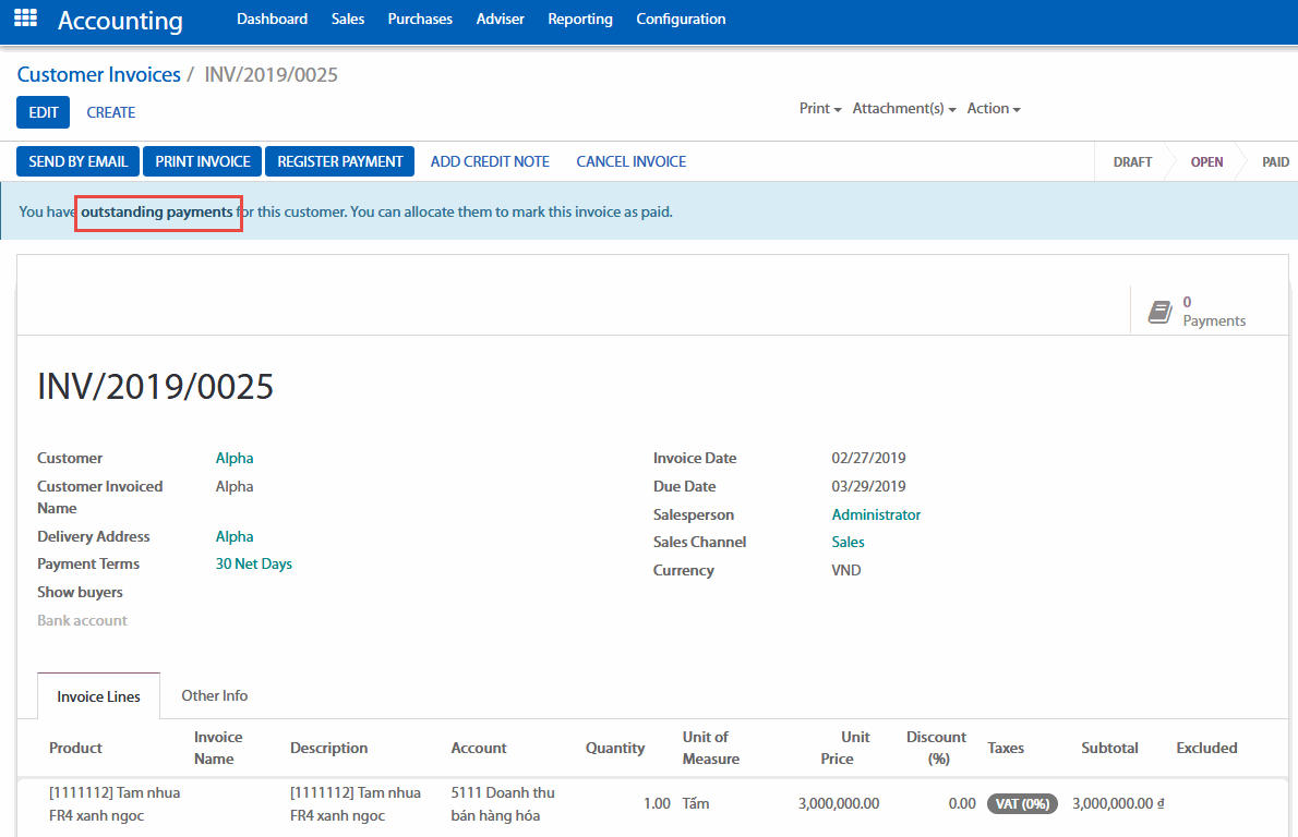 Khi xác nhận một hóa đơn mới, phần mềm sẽ cảnh báo bạn rằng sẽ có một khoản thanh toán nợ cho khách hàng hoặc nhà cung cấp này. Trong trường hợp đó, bạn có thể đối soát khoản thanh toán với hóa đơn ở gần khoản tổng bên dưới, dưới dòng “Outstanding Payments”.