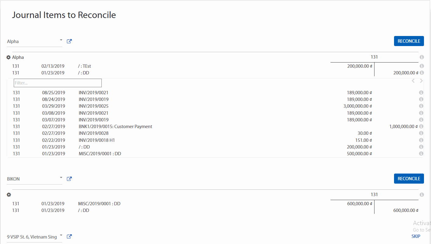 Chức năng đối soát hàng loạt sẵn có từ bảng điều khiển trong thẻ Hóa đơn khách hàng và thẻ Hóa đơn của nhà cung cấp để đối soát lần lượt các khoản phải thu và nợ phải trả.
