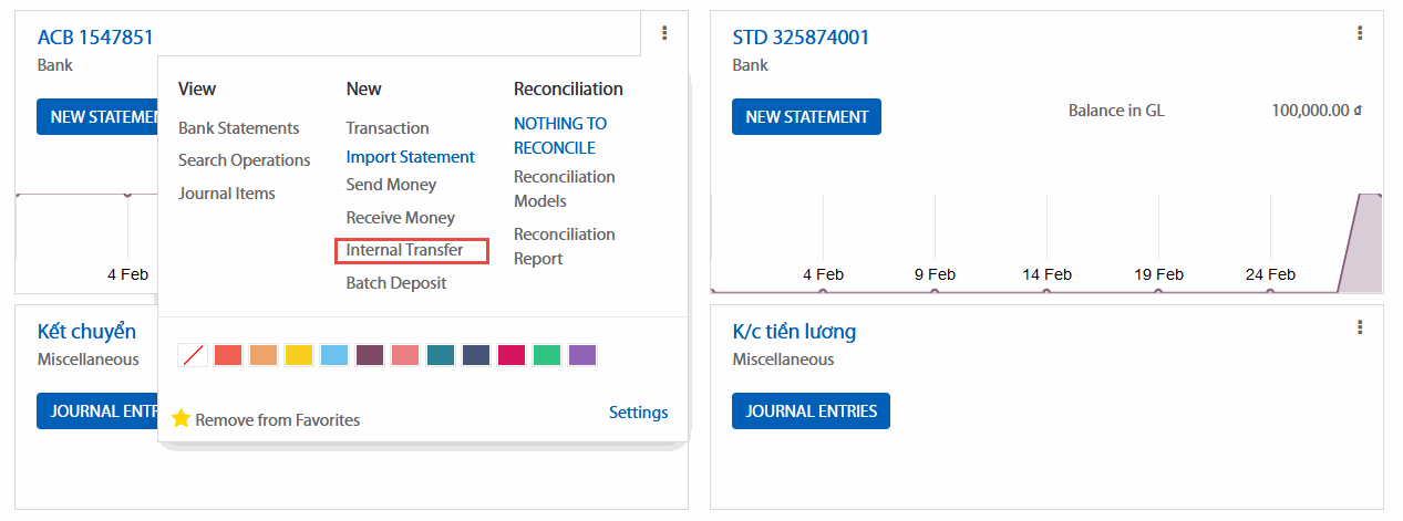 Giống như tạo một khoản thanh toán cho khách hàng hoặc nhà cung cấp, bạn chuyển đổi tiền mặt giữa các tài khoản ngân hàng của bạn từ bảng điều khiển hoặc từ bảng chọn ở phía trên cùng.