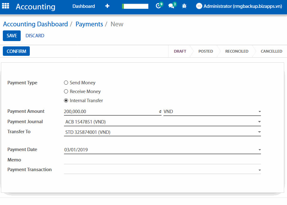 Khi chuyển nội bộ từ một tài khoản ngân hàng này sang tài khoản khác, chọn ngân hàng mà bạn muốn chuyển từ bảng điều khiển và trong màn hình đăng ký các khoản thanh toán, bạn chọn chuyển đến tài khoản. Đừng lặp lại quy trình này với một tài khoản ngân hàng khác nếu không bạn sẽ có hai khoản mục bút toán cho một giao dịch giống nhau.