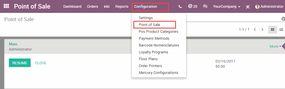 Chọn menu Configuration (Cấu hình) -> Point of Sale (Điểm bán hàng)
