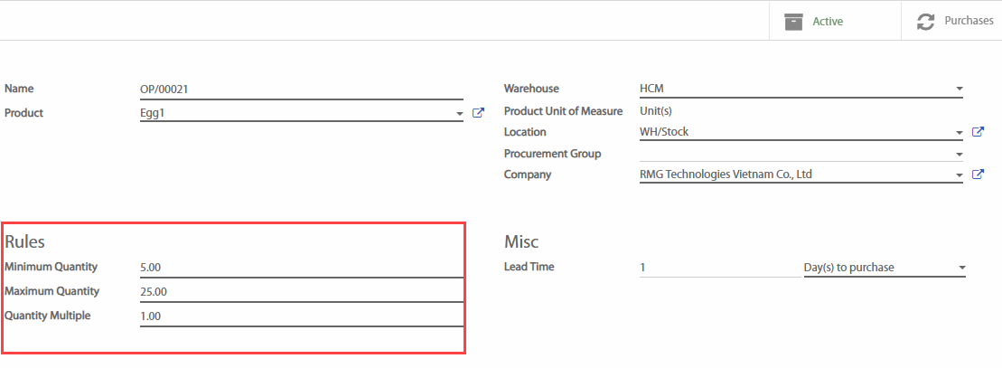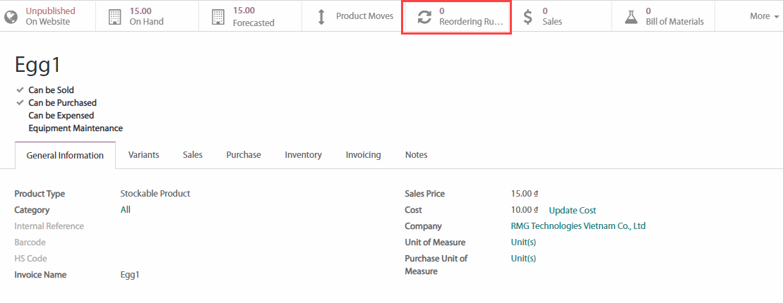 Cấu hình quy tắc tồn kho tối thiểu đã có sẵn trong Inventory (Tồn kho), Chọn Master Data (Dữ liệu gốc) > Product (Sản phẩm). Chọn một sản phẩm, trong tab sản phẩm có nút Reordering Rules (Quy tắc tái cung ứng).