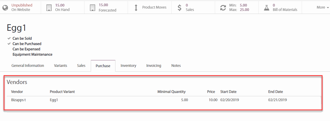 Sau đó, nhấp vào sản phẩm để truy xuất đến các biểu mẫu sản phẩm liên quan và trong Purchase (Mua hàng), đừng quên chọn Vendor (Nhà cung cấp).
