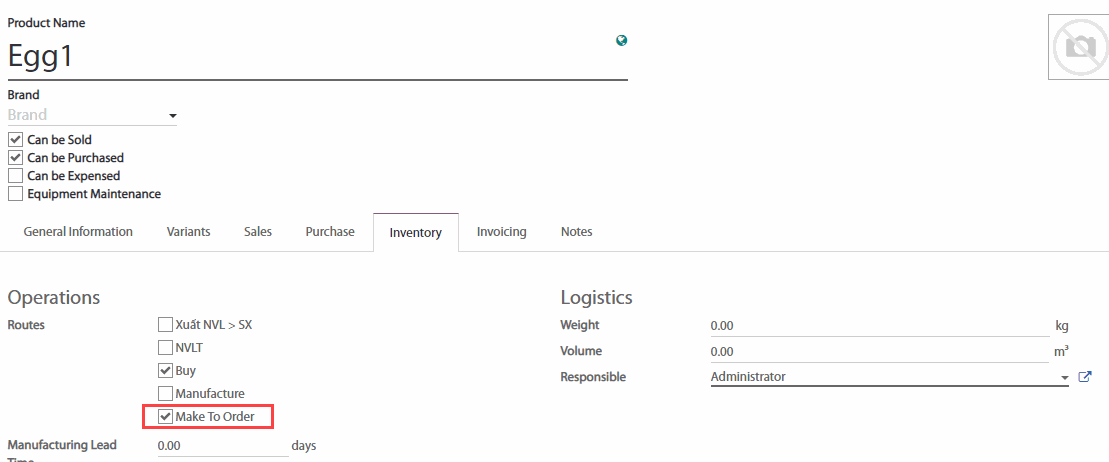 Trong biểu mẫu sản phẩm, dưới mục Inventory (Tồn kho), trong mục Operations (Hoạt động) nhấp chọn Make To Order (Cung ứng theo đơn mua hàng).