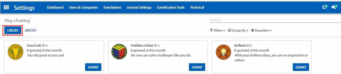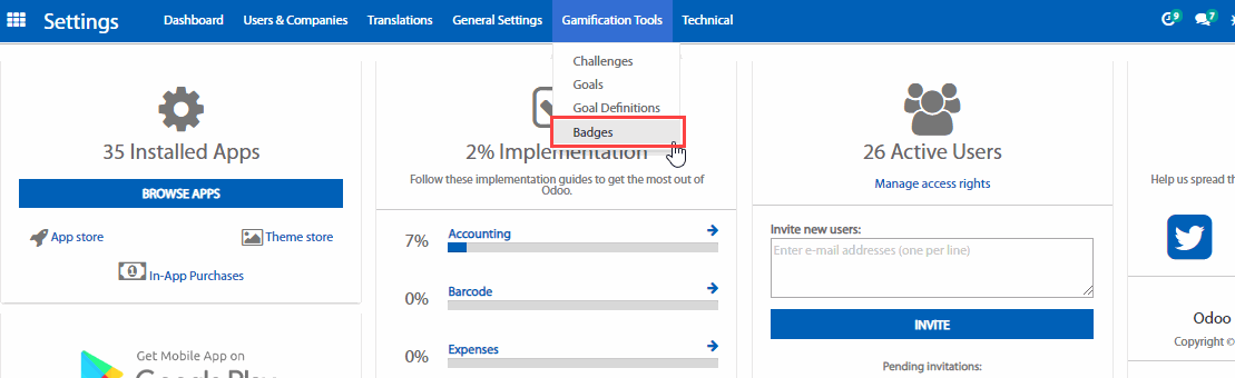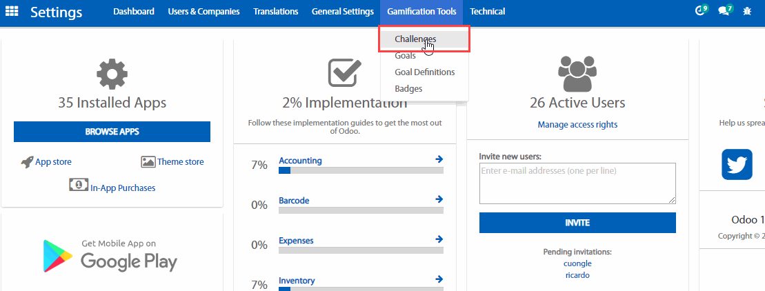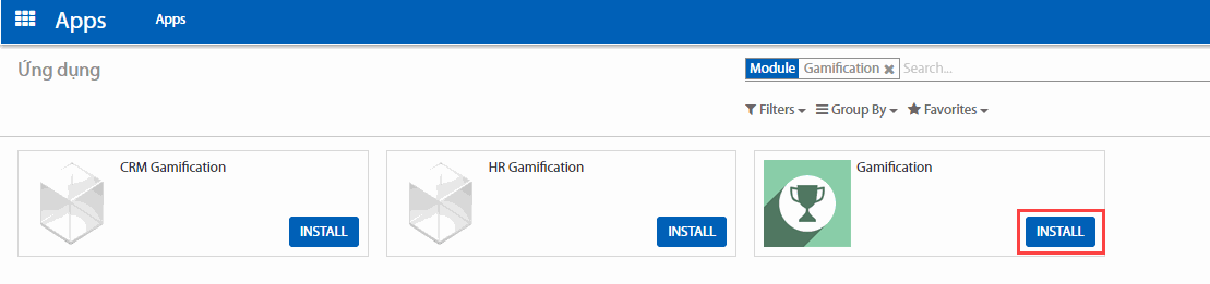 Từ phân hệ App (Ứng dụng) tìm và cài đặt mô đun Gamification. Bạn cũng có thể cài đặt phân hệ CRM gamification, nó sẽ thêm một vài dữ liệu hữu ích (mục tiêu và yêu cầu) có thể sử dụng được liên quan tới việc sử dụng mô đun CRM hoặc mô đun Sales.