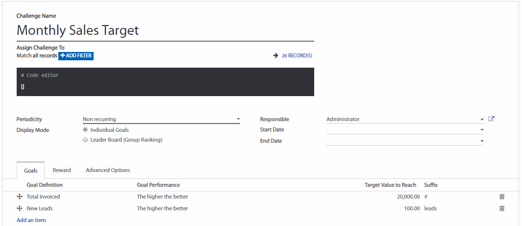 Ví dụ: Trong hình dưới có 2 yêu cầu cho 2 nhân viên với 1 form yêu cầu tên Monthly Sales Target. Yêu cầu sẽ dựa vào 2 mục tiêu: số lượng hóa đơn và số lượng tiềm năng mới tạo. Vào cuối mỗi tháng người thắng sẽ được một phần thưởng.