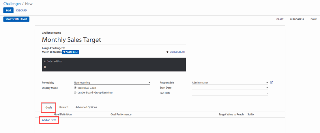 Mục tiêu thì được gán qua yêu cầu để ước lượng và so sánh với của các thành viên trong đội với mỗi người qua mỗi thời gian. Bạn có thể tạo mới mục tiêu từ form Challenge (Thử thách) bằng cách nhấn vào Add an item (Thêm một hạng mục).