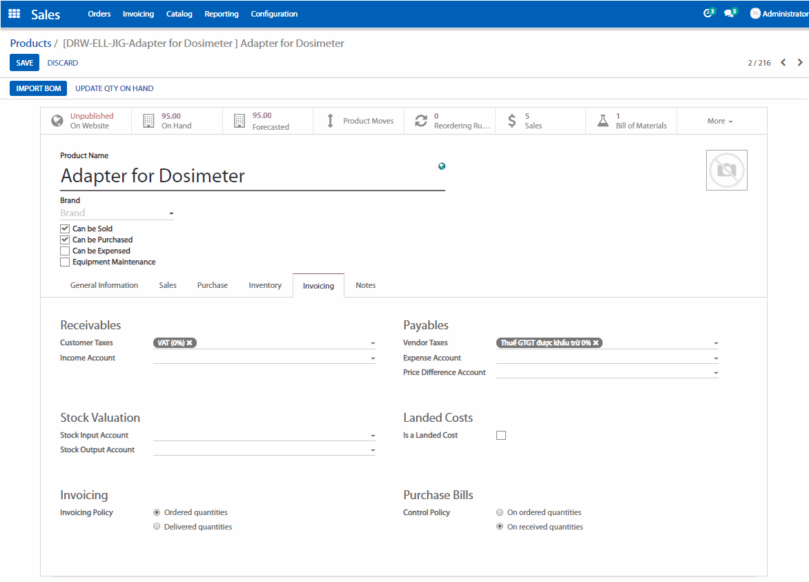 - Invoicing Policy (Chính sách hóa đơn): chọn lập hóa đơn dựa vào Ordered quantities (Số lượng đặt hàng) hoặc Delivered quantities (Số lượng đã giao)
