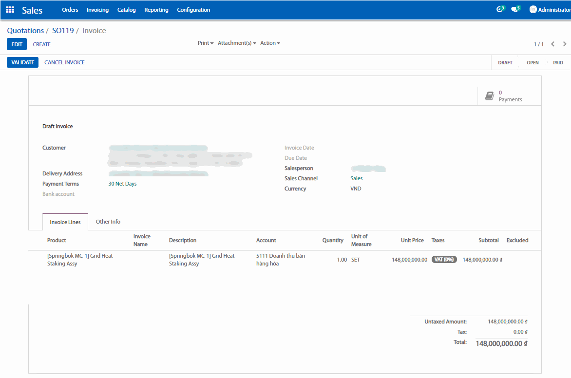 Bây giờ thì hạn mức hoặc sản phẩm đã được tạo ra, bạn có thể tạo ra một báo giá hoặc đơn bán hàng với mỗi dòng tương ứng với mỗi hạn mức.