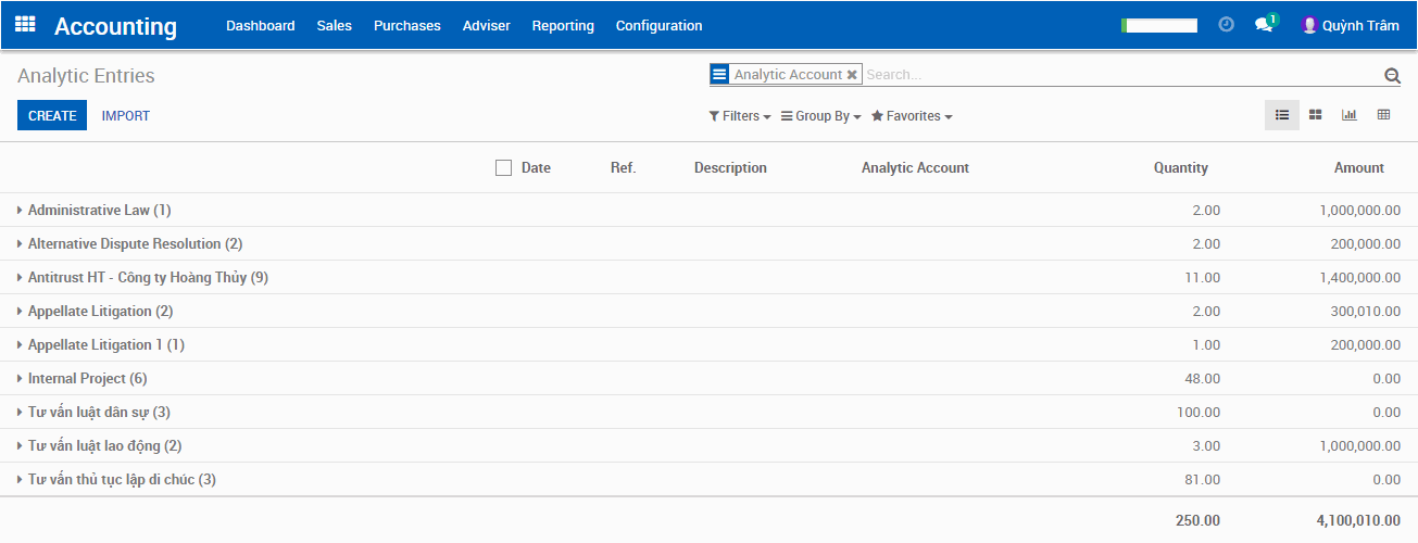 Ta có thể theo dõi doanh thu chi phí và lợi nhuận của từng matter tại màn hình Analytic Account.