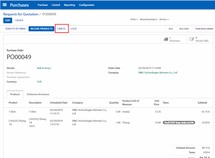 Trong trường hợp này, 2 trong số 5 T-Shirt đã nhập về trước khi bạn cần hủy PO