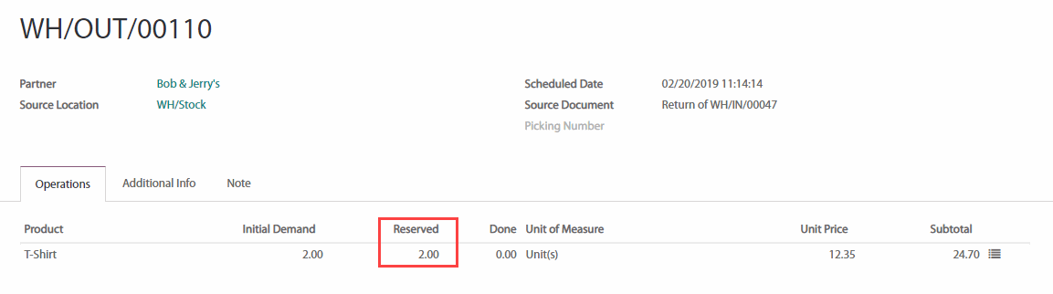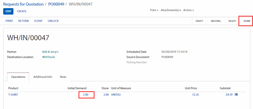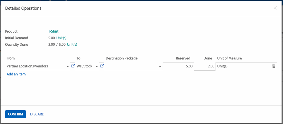 Đầu tiên, chúng ta sẽ lấy trường hợp đặt hàng sau đây làm ví dụ. Bạn đặt hàng 5 T-Shirt và 1 Thùng 1A chưa đến nơi trữ kho của bạn. Bởi vì khi sử dụng Mô-đun Purchase (Mua hàng), ứng dụng Inventory (Tồn kho) cũng được yêu cầu cài đặt, bạn cũng sẽ thấy thú vị khi xem trường hợp hàng hóa được giao từng phần mà bạn muốn hủy.