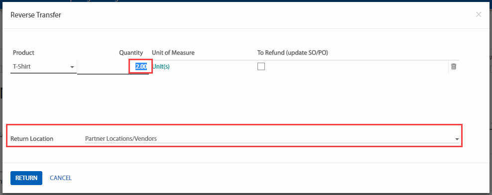 Bây giờ, bạn cần trả lại nhà cung cấp sản phẩm T-Shirt nhận được. Để làm điều này, bấm vào nút RETURN (TRẢ HÀNG) phía trên. Một cửa sổ giao trả hàng sẽ hiện lên. Nhập số lượng trả lại và vị trí tương ứng và bấm vào RETURN (TRẢ HÀNG).