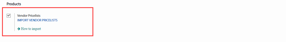 Trong ứng dụng Purchase (Mua hàng), Tên menu chọn Configuration (Cấu hình) > Settings (Thiết lập), tìm đến mục Products ( Sản phẩm) chọn Vendor Pricelists (Bảng giá Nhà cung cấp).