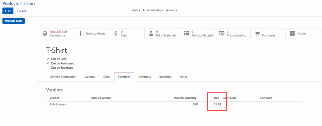 Sau khi nhập, mục Vendors (Nhà thầu) trong tab Inventory (Kho) của sản phẩm sẽ được cập nhật.