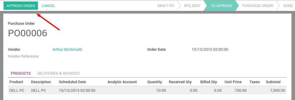 Đăng nhập với tư cách người dùng phân hệ Mua hàng, tạo đơn đặt hàng với số lượng nhiều hơn so với số lượng thiết lập ở trên và xác nhận. Đơn đặt hàng sẽ ở trạng thái To Approve. (Chờ duyệt)