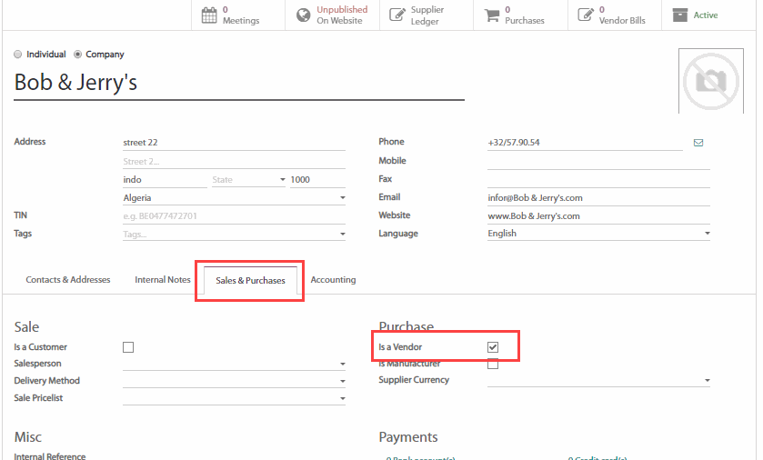 Bước thứ hai là tạo ra một nhà cung ứng. Trong trường hợp này chúng ta sẽ tạo ra nhà cung cấp Bob & Jerry's. Nhập mô-đun Purchase (Mua hàng), chọn Purchase (Mua hàng) > Vendors (Nhà cung cấp) và tạo ra một nhà cung cấp mới. Bạn có thể lựa chọn liên lạc là một công ty hay một cá nhân, điền vào các thông tin cơ bản như địa chỉ, điện thoại, email...