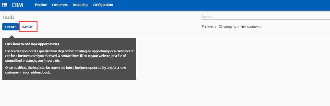 Việc kích hoạt này sẽ tạo ra 1 menu con tên Leads (Tiềm năng) nằm ở dưới menu Pipeline (Cơ hội) trong Phân hệ CRM. Từ đó bạn có thể nhập liên hệ từ nút Import (Nhập)nếu bạn muốn tạo ra một Đối tượng bán hàng theo cách thủ công.