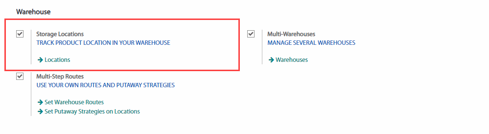 Để tạo một địa điểm mới, bạn phải cấu hình cho hệ thống có thể quản lý nhiều địa điểm. Trong mục Invetory (Tồn kho), vào Configuration(Cấu hình) > Settings (Thiết lập), ở mục Warehouse (Nhà kho), đánh dấu vào nút trên dòng Storage Locations (Vị trí lưu trữ), sau đó nhấn SAVE (LƯU).