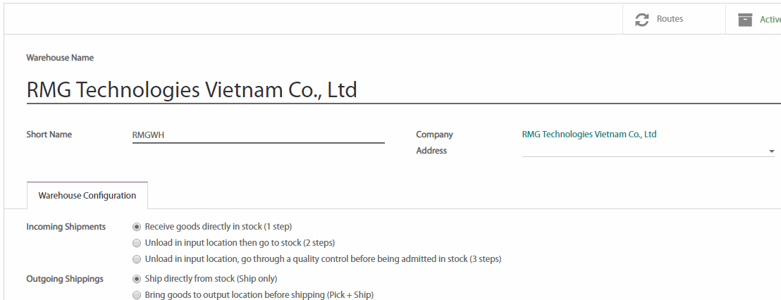 Chú ý: Khi bạn tạo một nhà kho, hệ thống sẽ tạo loại vận chuyển cần thiết cho kho và giữ những địa điểm con cho địa điểm chính này trên giao diện.
