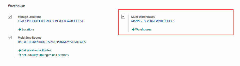 Để tạo một nhà kho mới, bạn phải cấu hình cho hệ thống có thể quản lý nhiều Kho. Trong Invetory (Tồn kho), trên menu vào Configuration(Cấu hình) > Settings (Thiết lập), ở mục Warehouse (Nhà kho), đánh dấu vào nút trên dòng Multi-Warehouses(Đa kho), sau đó nhấn SAVE (LƯU).