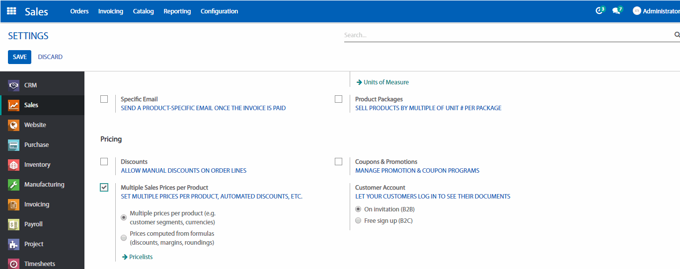 Tìm và click vào Multiple Sales prices per product, chọn Save (Lưu) để áp dụng