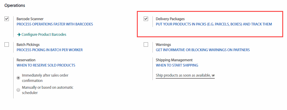 Để cấu hình việc sử dụng các gói hàng, đi đến menu Inventory (Tồn kho) > Configuration (Cấu hình) > Settings (Thiết lập). Ở mục Operations (Hoạt động), chọn Delivery Packages (Giao hàng theo gói).