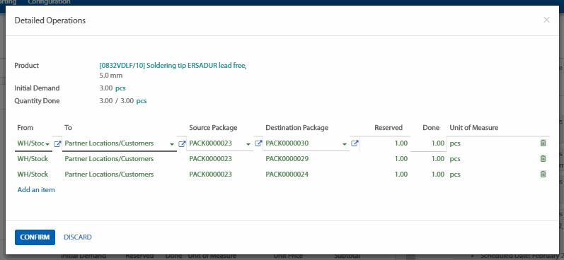 Chọn số lượng mà bạn muốn tách ra cho gói hàng đầu tiên trong cột Done (Hoàn thành) , sau đó nhấp vào nút Put in Pack (Đóng gói).