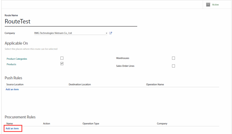 Quy tắc thu mua được thiết lập trong hệ thống quy tắc xử lí kho. Trong ứng dụng Kho, đi đến Configuration (Cấu hình) > Routes (Tuyến cung ứng).