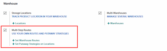Đến ứng dụng Inventory (Tồn kho), Configuration (Cấu hình) > Settings (Thiết lập) tìm đến mục Warehouse (Kho hàng) và chọn Multi-Step Routes (Các Tuyến nhiều bước).