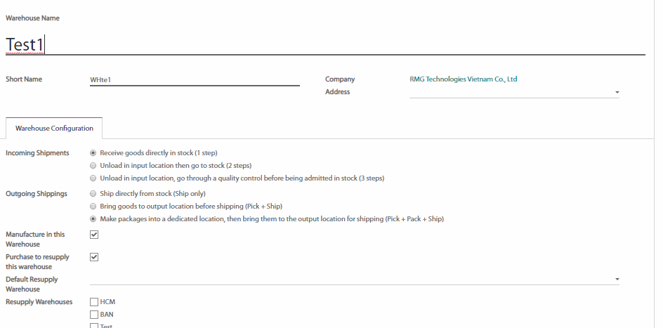 Trong tab Warehouse Configuration (Cấu hình kho hàng), thiết lập 1 số quy tắc theo lựa chọn của bạn. Ví dụ ở đây là chọn xuất kho theo 3 bước.