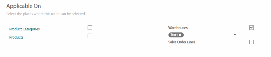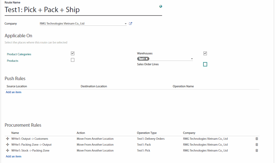 Nếu bạn chọn Warehouses (Nhà kho) thì phải chọn nhà kho nào để áp dụng quy tắc xử lý. Quy tắc xử lý sẽ được thiết lập cho tất cả các luân chuyển trong nhà kho đó để đáp ứng tất cả các điều kiện về quy tắc thu mua và đẩy