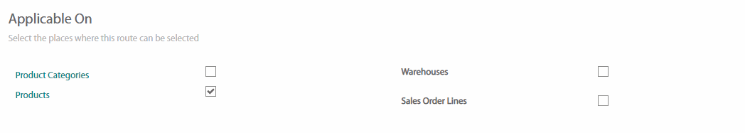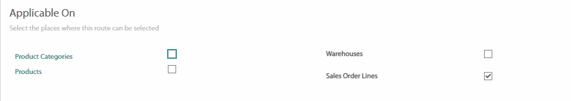 Khi thực hiện 1 yêu cầu thu mua thì bạn có thể áp dụng các quy tắc mà bạn muốn sử dụng. Trên sản phẩm Inventory (Tồn kho), Master Data (Dữ liệu gốc) > Products (Sản phẩm), nhấp chọn các mục trong phần Routers (Tuyến cung ứng).