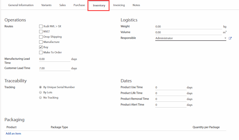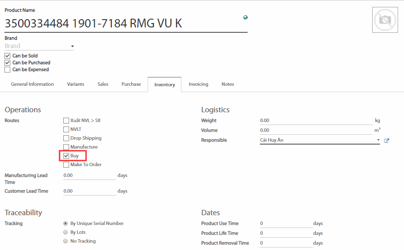 Mở sản phẩm bạn muốn áp dụng các quy tắc Inventory (tồn kho) > Master Data (Dữ liệu gốc) > Products (Sản phẩm). Trong tab Inventory (Tồn kho), chọn các quy tắc: