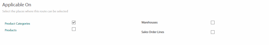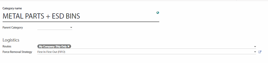Mở sản phẩm bạn muốn áp dụng các quy tắc xử lý này Configuration (Cấu hình) > Product Categories (Nhóm sản phẩm). Chọn các quy tắc xử lý trong mục Logistics (Tuyến hậu cần):