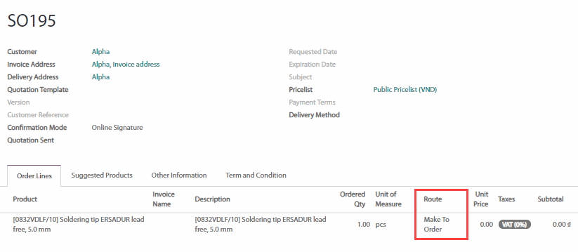 Nếu bạn không xử lý tồn kho hoặc quy tắc tồn kho tối thiểu thì tốt hơn nên sử dụng quy tắc xử lý Make To Order (Cung ứng theo đơn hàng). Kết hợp với quy tắc Buy (Mua) hoặc Manufacture (Sản xuất) để kích hoạt tự động đơn mua hàng hoặc đơn đặt hàng sản phẩm khi sản phẩm tồn kho đã hết.
