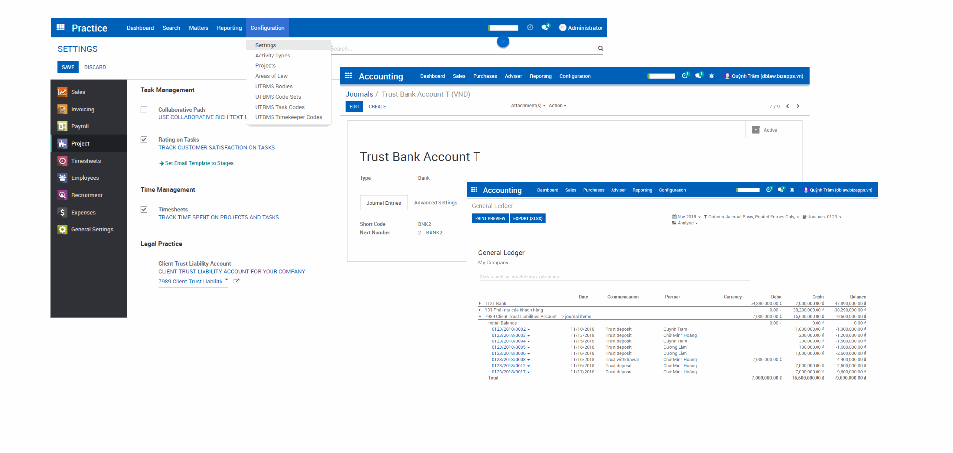 Vào menu Practice > Configuration > Settings > cấu hình tài khoản tại Client Trust Liability Account.