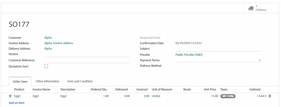 Một khi đã xác nhận đơn bán hàng thì bạn cần nhấp vào Delivery (Giao hàng) để trở lại đơn giao hàng