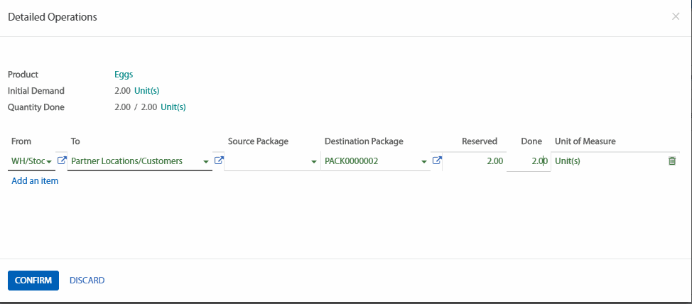 Trong tab Operations (Hoạt động) , tại cột cuối cùng, thay đổi giá trị 0 và thiết lập số lượng sản phẩm mà bạn muốn đóng gói. Sau đó nhấp vào Put in Pack (Đóng vào gói)