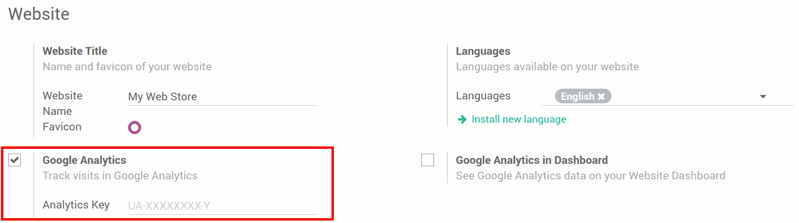Đi tới menu Cấu hinhfcuar ứng dụng Odoo's Website của bạn. Trong cài đặt, bật Google Analytics và dán ID theo dõi. Sau đó, lưu trang.